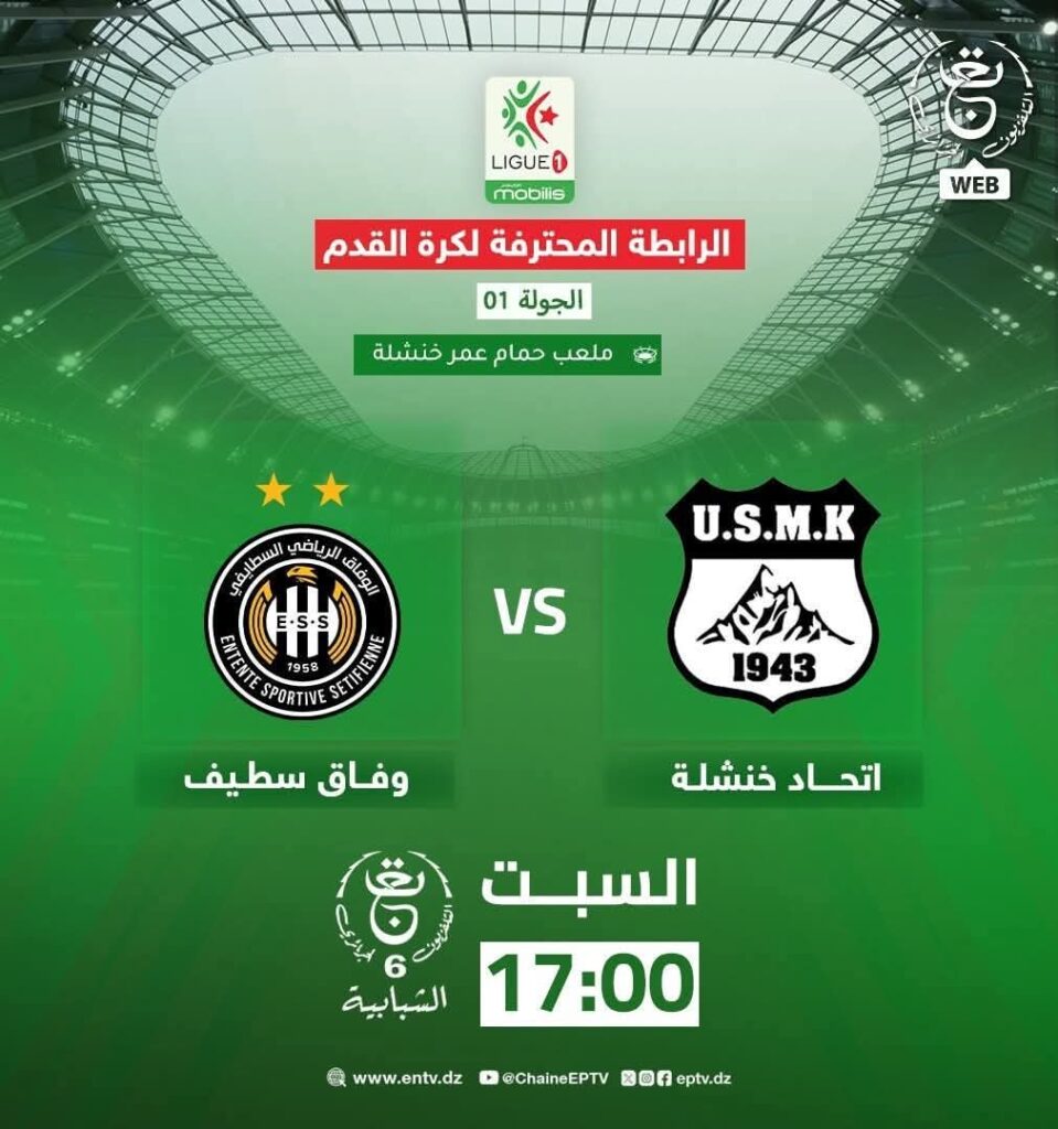 وفاق سطيف أون لاين: تُبث مباراة وفاق سطيف أمام مضيفه اتحاد خنشلة، المقررة غدًا السبت لحساب الجولة الأولى من الرابطة المحترفة الأولى لكرة القدم، مباشرة عبر القناة السادسة الشبابية.
